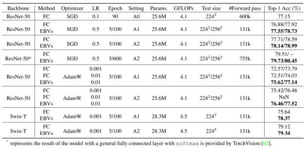Comparison experiments are conducted in classification tasks on ImageNet-1K datasets, instance segmentation and target detection tasks in MS COCO datasets, semantic segmentation tasks in ADE20K datasets, and a large number of downstream classification tasks. Here, the classification results in the ImageNet-1K datasets are taken as an example. To prove the effectiveness of EBVs, we refer to the most advanced training method provided by TorchVision for baseline comparison. We provide three different training settings: