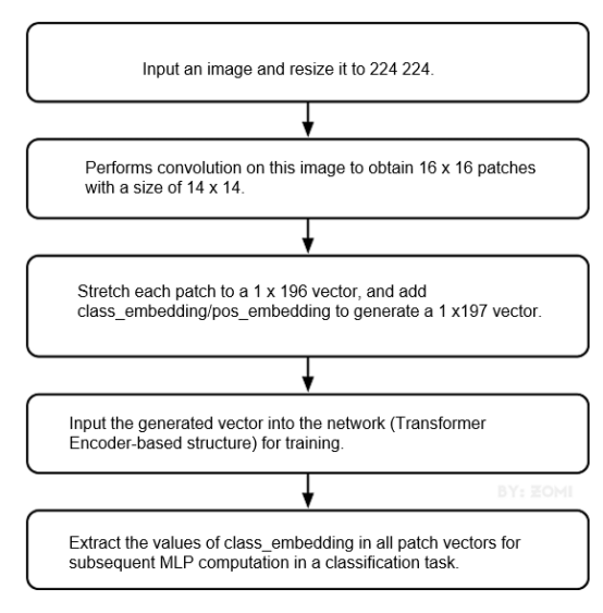 ViT is mainly applied to the image classification field. Compared with the conventional Transformer model, it has the following features: