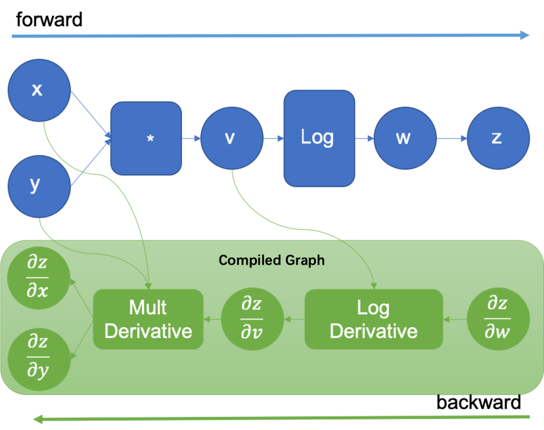 Take a simple function f(x, y) = log(x*y) as an example. The forward execution requires two operators, mul and log. The backpropagation uses the chain method for differentiation.