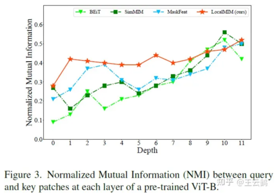 - When a downstream task is fine-tuned, a higher layer usually quickly adapts to the new task, while a lower layer changes slowly. The lower layer needs to fully learn data in the pre-training phase. Therefore, layer-wise learning rate decay in NLP or CV downstream tasks usually yields the optimal outcome. To intuitively display learning degrees of semantic associations between patches at different layers of a model, we examine Normalized Mutual Information (NMI) between query and key patches at each year, as shown in Figure 3.