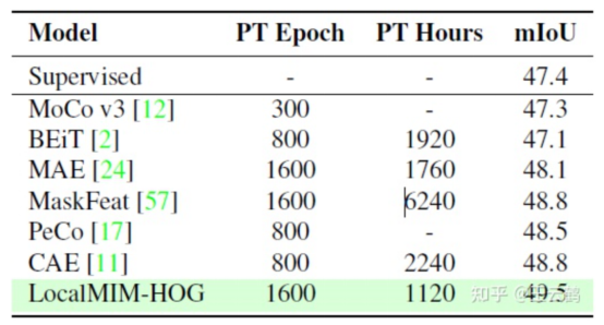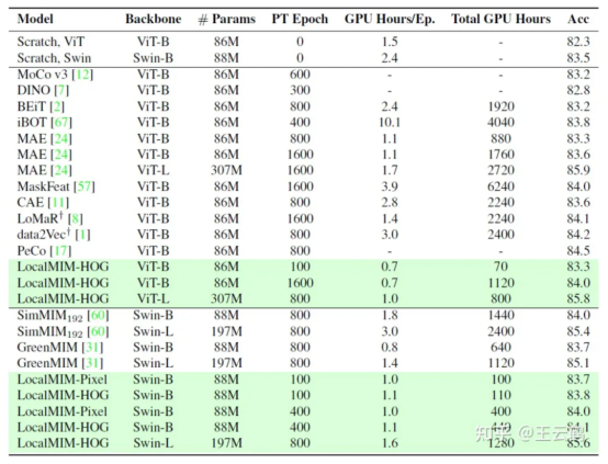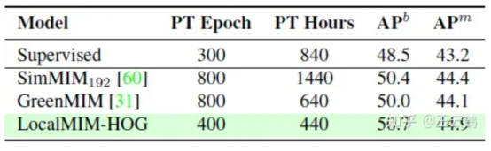 As shown in Table 1, LocalMIM has better efficiency than existing models. Specifically, in terms of top-1fine-tuning accuracy on ImageNet-1K, LocalMIM outperforms other models. It is 3.1 times faster than MAE, 5.6 times faster than MaskFeat, 3.6 times faster than SimMIM192, and 6.4 times faster than GreenMIM. As can be seen from Tables 2 and 3, LocalMIM achieves better performance with significantly less computational costs in downstream detection and segmentation tasks. For other ablation experiments and implementation details, refer to the paper.