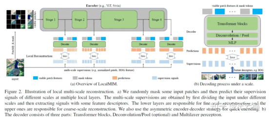 Additionally, much work of vision backbone network design has shown that coarse- and fine-scale at high and low layers of a feature map brings benefits to various vision tasks (detection, segmentation, and classification). Generally, a lower layer learns fine-scale information and a higher layer learns coarse-scale information. Therefore, we construct multi-scale supervision signals (by selecting different p) from the original input to reconstruct multiple local layers, so that a lower layer reconstructs fine-scale supervision signals and a higher layer reconstructs coarse-scale supervision signals. In addition, our method is compatible with "acceleration encoding". In particular, we use the methods in MAE and GreenMIM, that is, input only visible patches to the encoder. Figure 2(a) shows the overall process of the algorithm. Figure 2(b) demonstrates a decoding process at a specific scale. A decoder includes three parts: transformer blocks for inference, Deconvolution/Pool for scaling, and MLP for prediction. Transformer blocks infer the information about blocked patches based on visible patch representations. Deconvolution/Pool handles a process when scales of features and supervision signals are inconsistent. For example, for columnar architectures like ViT, feature scales at each remain unchanged while supervision-signal scales change. When they become inconsistent, we use the deconvolution/pool operations to conduct up/down sampling. MLP integrates predictions after scaling as the final output. A model with a pyramid architecture is generally divided into multiple stages. We introduce a reconstruction task to the end of each stage. For a columnar architecture, we select some layers for reconstruction based on the experience of processing pyramid architectures.