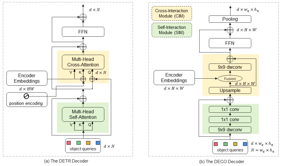 Compared with DECO Encoder, the replacement of decoder is much more complex. The main function of the decoder is to fully interact with image features and queries, so that the queries can fully perceive the image features, so as to predict coordinates and categories of the objects in the image. DECO Decoder mainly includes two inputs: feature output of the encoder and a group of learnable query vectors (Query). The decoder can be divided into two major modules: self-interaction module (SIM) and cross-interaction module (CIM).