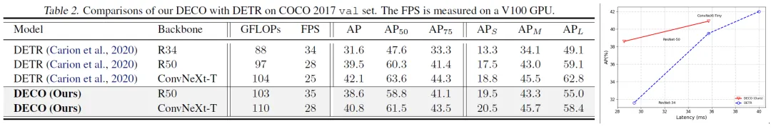 We have conducted experiments on COCO. We compared DECO with DETR while keeping the main architecture unchanged. For example, we keep the number of queries consistent and the number of Decoder layers unchanged. We only replace the Transformer architecture in DETR with our convolution architecture as formerly described. It can be seen that DECO achieves tradeoff with better precision and speed than DETR.
