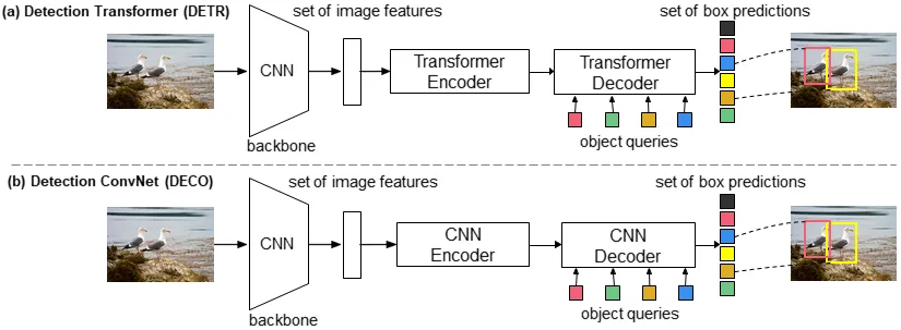 For an input image, DETR utilizes the Transformer Encoder-Decoder architecture to interact with image features by using a group of queries. In this way, a specified number of box predictions can be directly output, eliminating the dependency on post-processing operations such as non-maximum suppression (NMS). The overall architecture of DECO is similar to that of DETR. DECO also includes backbones for image feature extraction and an encoder-decoder architecture for interaction with queries, and outputs a specific number of detection results. The only difference is that the encoder and decoder of DECO are pure convolutional architectures. Therefore, DECO is a query-based end-to-end detector consisting of pure convolution.