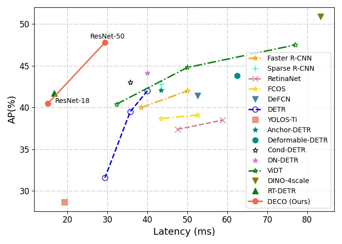 We also compared DECO with cross-scale features with more object detection methods, including DETR variants. As shown in the following figure, DECO has achieved better performance than many previous detectors.
