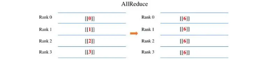 (1) AllReduce: sums up the input tensors and produces identical output values across all involved cards.