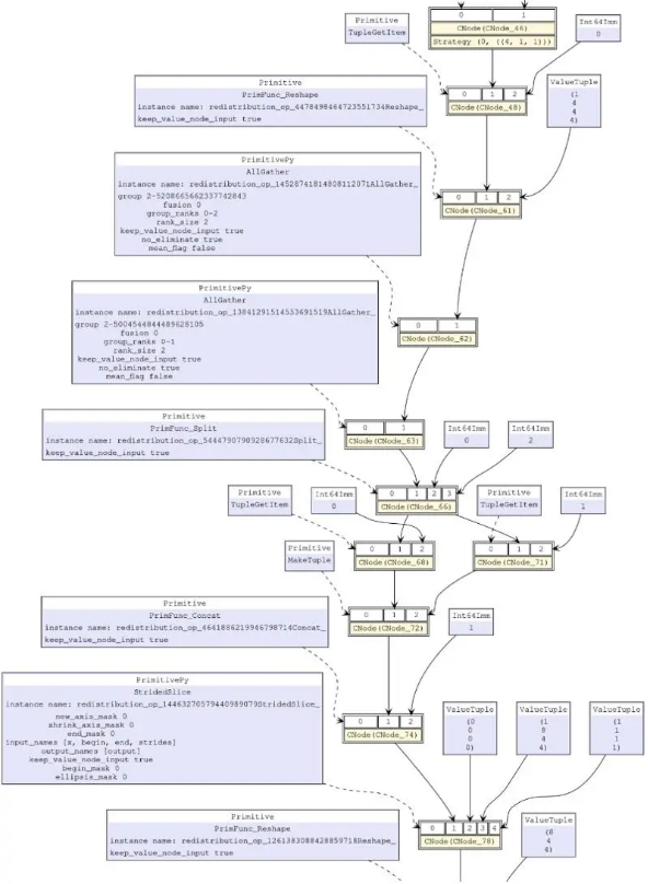 The distributed operator further determines whether to insert additional computation and communication operations into the computational graph based on the tensor distribution model to ensure that the operator compute logic is correct. Tensor redistribution involves tensor sharding and aggregation, which primarily utilize the StridedSlice and Concat operators. Additionally, it necessitates communication across different compute nodes, and this is handled by the AllGather communication operator. To support complex numbers in distributed processes of MindSpore, the support for complex numbers in operators involved in tensor redistribution also needs to be considered.
