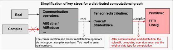 In distributed training, there are certain challenges within the industry pertaining to complex numbers. In a parallel process, data communication and aggregation across different compute nodes are frequently required, in which communication operators are responsible for synchronizing model parameters and aggregating gradients across these compute nodes. The current common communication libraries used in the industry, such as NVIDIA Collective Communications Library (NCCL) and Huawei Collective Communication Library (HCCL), do not support complex numbers. This poses a significant challenge when it comes to enabling the distribution feature of complex operators.