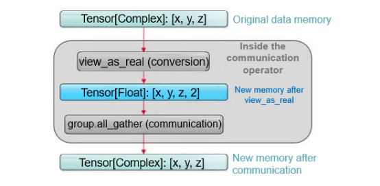 It must be clarified that if there is no intention to support complex numbers directly in communication libraries, then finding ways to accommodate complex numbers within the framework becomes a necessary approach. For reference, other frameworks utilize the view_as_real function to convert Complex64 tensors into Float32 tensors in communication operators prior to executing actual operations. If the shape of the original complex tensor is [x, y, z], it changes to [x, y, z, 2] after the conversion. That is, a dimension whose size is 2 is added to the end of the tensor, the length of the data type is halved, and the size of the occupied memory space remains unchanged. The reason why this operation is possible is due to the inherent characteristics of Complex64.