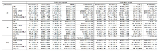In the paper, experiments are also carried out on typical causal discovery synthetic datasets. As shown in Table 1, MgCSL outperforms the baselines in most metrics, and its precision is still high even on high-dimensional graphs. In addition, the simplified acyclicity penalty enables MgCSL to provide effective results in a shorter period of time, ensuring its feasibility in real-world applications.