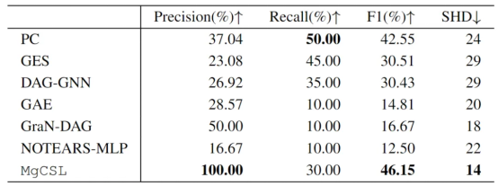 In order to further verify the effectiveness of MgCSL, experiments are also carried out on the Sachs protein signaling dataset. The results in Table 2 show that MgCSL still exhibits competitive performance compared with its rivals, surpassing them in terms of precision, F1 and SHD, and identifying six correct causal edges. This indicates that MgCSL's obvious potential in practical applications.
