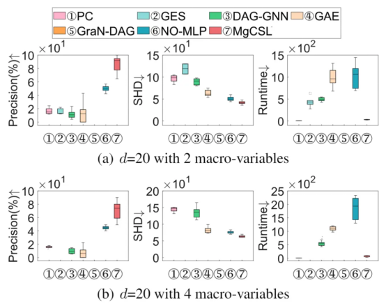As shown in Figure 2, the presence of macro variables affects the precision of the baselines. Even on small graphs, their precision is as low as 0.5 or even lower. MgCSL can extract valuable information from multi-granularity variables for DAG learning, achieving optimal performance in precision and SHD with less time consumption.
