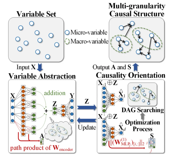 To address the aforementioned problems, MgCSL is proposed in the paper. As shown in Figure 1, the algorithm first constructs a sparse autoencoder (SAE) to explore effective coarse-grained strategies and extract causal variable abstractions. The encoded representations are summed to obtain latent macro-variable representations, and then the decoder reconstructs the observation data. The contribution matrix from micro variables to macro variables is extracted from the path product of encoder parameters. Next, MgCSL builds a multiple layer perceptron (LMP) for each micro variable, taking both micro- and macro-variables as inputs to explore potential causal mechanisms. In order to further improve efficiency, MgCSL introduces simplified acyclicity constraints to identify causal connections between multi-granularity variables and discover multi-granularity causal structures.