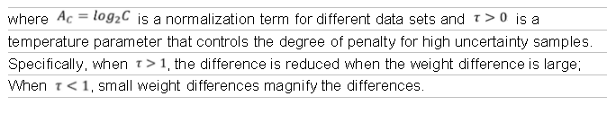 C indicates the total number of label types. The teacher network is used for uncertainty estimation because it is more stable than the student network. On the basis of this estimation, the weight of each sample is re-calibrated using a negative exponential function: