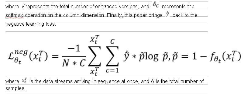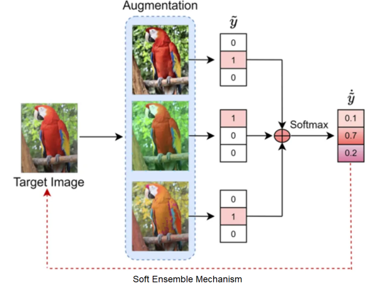 In order to improve the accuracy of complementary pseudo labels, an ensemble mechanism is also used to summarize the complementary labels output by the models of different augmented versions of the same target image. The enhancement tools include color jitter, random affine, Gaussian blur, random horizontal flipping, and Gaussian noise, as shown in the preceding figure. Finally, the softmax operation is used to simulate the real label distribution to prevent model overfitting. The process can be expressed as: