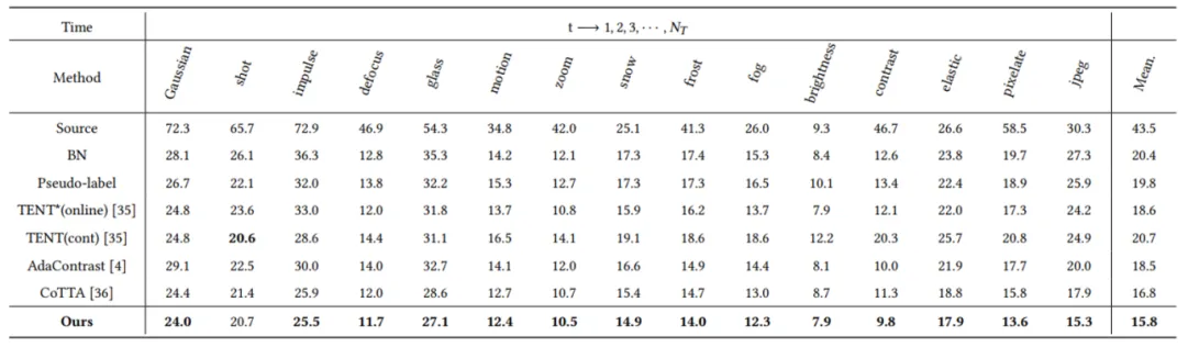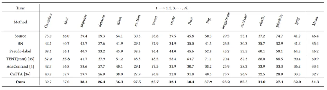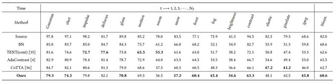 This paper experiments on multiple public datasets, including CIFAR10-to-CIFAR10C, CIFAR100-to-CIFAR100C and ImageNet-to-ImageNet-C. The experimental results show that the proposed method has better performance than other methods (the index is the classification error rate).