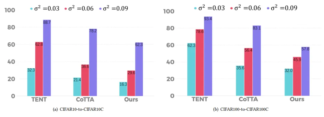 In this paper, Gaussian noises with variances of 0.03, 0.06 and 0.09 are added to each image in the target domain to test the robustness of the method against strong noise. The classification error rates (%) on the CIFAR-10C and CIFAR-100C datasets are obtained.