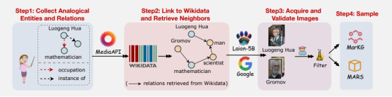 The construction process of the multimodal analogical reasoning dataset MARS and the underlying multimodal knowledge graph MarKG is shown in figure 2. First, seed entities and relations are collected from two text analogical reasoning datasets E-KAR and BATs. Then, these entities and relations are mapped to the large knowledge base Wikidata, unified, and standardized. After that, entity images are retrieved from the Google image search engine and multimodal data Laion-5B, and a series of measures are used to filter low-quality images. Finally, high-quality analogy data is retrieved to construct the MARS dataset.