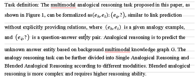 For multimodal knowledge graph embedding models, the paper adopts a pipeline approach to solve analogical reasoning, including three steps: abduction, mapping, and induction. Among them, abduction is used to predict the potential relationship of the analogy example
