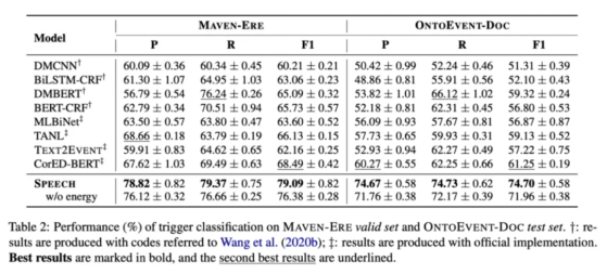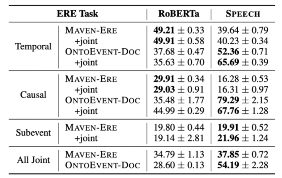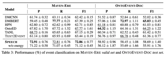 The experiment results suggested that the SPEECH model demonstrated superior performance in trigger classification and event classification tasks of MAVEN-ERE dataset, and had obvious advantages in trigger classification and event-relation classification tasks of OntoEvent-Doc dataset. Overall, the SPEECH model performed well in most of the tasks, but its effect was also affected by the datasets and data distribution.