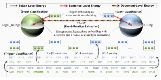 The design of the SPEECH model is mainly inspired by the law of gravity and the energy function. If an abstract event class is considered as an electron nucleus or a star, its corresponding sample can be considered as an extranuclear electron or a planet. Therefore, the authors proposed to use energy-based hyperspheres to model event classes and their samples. The model is mainly associated with the energy of three levels: token, sentence, and document.