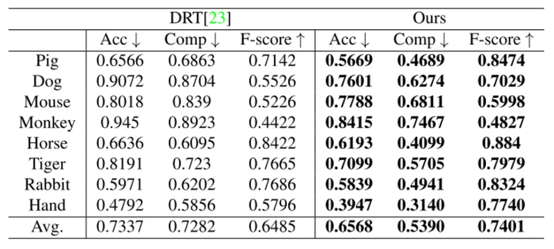 In this paper, full-view and sparse-view experiments are performed on the DRT dataset and custom dataset. To evaluate the quality of the reconstructed model, this paper calculates the quantitative indicators including accuracy, completeness, precision, recall, and F-score, between the reconstructed model and the real model. Experiments show that the method in this paper can achieve high-quality reconstruction of transparent objects, and is better than the previous methods.
