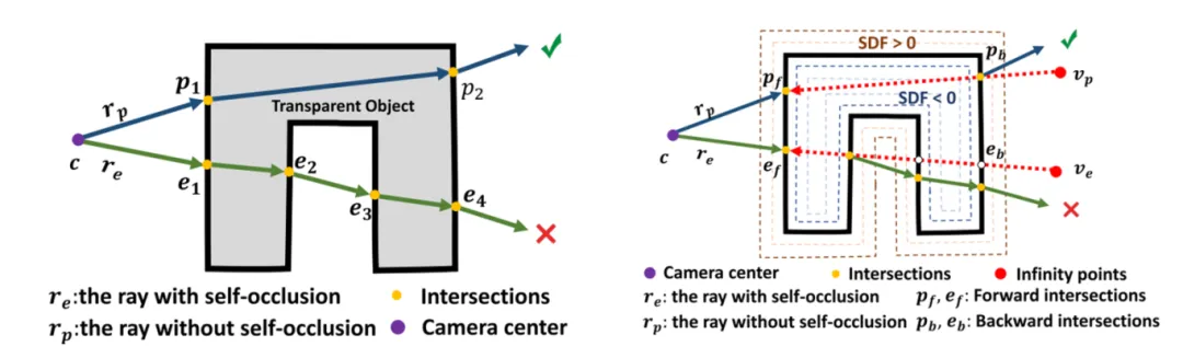 The following figure shows the transparent object self-occlusions and self-occlusion detection strategy. The left figure shows two beams of light. rp is a light that is not self-occluded, and re is a self-occluded light. The rp light undergoes two refractions (on entry and exit), and is a valid light ray. The re light undergoes multiple refractions, indicating that self-occlusion exists, which affects the reconstruction precision. Therefore, the re needs to be discarded. The right figure shows the self-occlusion detection strategy. There is no self-occlusion on the path of the rp light. Therefore, the SDF values of the points on the rp light path are less than 0. Self-occlusion exists on the re light path. Therefore, in the re light path within the object, there are points whose SDF values are either less than 0 or greater than 0.