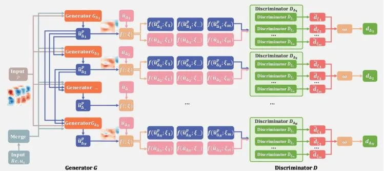 Figure 1 shows the Cascade-Net model architecture. Cascade-Net uses the surface pressure, Re, and a small number of wake velocity measurement points as the input. Considering the historical effect of flow development, the input feature p in the figure is the spatiotemporal feature matrix of the fluctuating pressure within the feature period, and the feature period covers at least one fluctuating pressure period. The model consists of multiple sub-generative adversarial networks (sub-GANs). Each sub-GAN is used to predict the fluctuating velocity field at a specific scale.