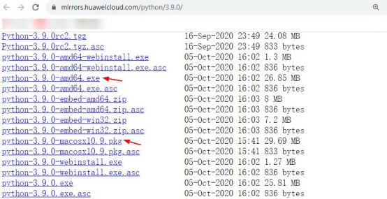 (If you cannot access the Python official website or the download speed is slow, you are advised to download the installation package of the corresponding version by using images of Huawei Mirrors or the third-party source (https://registry.npmmirror.com/binary.html?path=python/3.9.0/)).