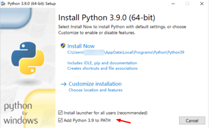 Note: During the installation, select Add Python 3.9 to PATH to automatically set the environment variables.