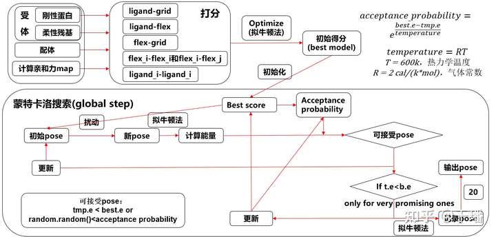 在完成初始化之后,软件会基于蒙特卡洛树搜索来搜索足够多的pose,每次会对初始pose随机施加旋转,平移和扭矩旋转等扰动,当然施加的扰动不会使得两者离得过远,要保证两者的距离不能超过2 。之后还会再一次使用BFGS法来计算新的pose的能量作为当前pose的打分。根据这个得分和best score的对比来判断当前pose是否为一个合理的可以接受的pose。如果当前pose的能量值(tmp.e 或者 t.e)小于best score(best.e 或者 b.e)则可以接受,如果tmp.e < best.e,则要根据acceptance probability来计算这个pose被接受的概率。