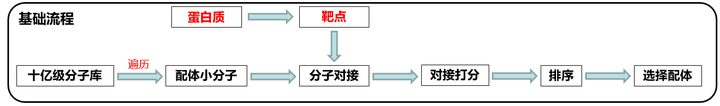 那么如何有效选取一个合适的小分子化合物与目标蛋白质对接就成为了一个至关重要的问题。在传统的分子虚拟筛选中,人们会遍历整个小分子化合物的库,让库中的所有小分子与蛋白质去对接,获得大量的复合物,之后通过计算对接的结合能,求得小分子的得分。最后根据得分来对小分子进行排序,再选取分数较高的一部分小分子来进行之后的制药实验。整个流程的流程图大致如图1所示。