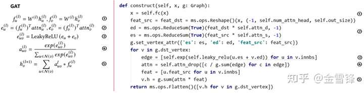 通过创新性的提出以节点为中心的编程范式,相较于消息传递范式,更贴近GNN算法逻辑和Python语言风格,MindSpore Graph Learning可以做到公式到代码的直接映射,如下图GAT网络代码所示。基于此,用户无需进行任何函数封装,即可快速直接地实现自定义的GNN算法/操作。
