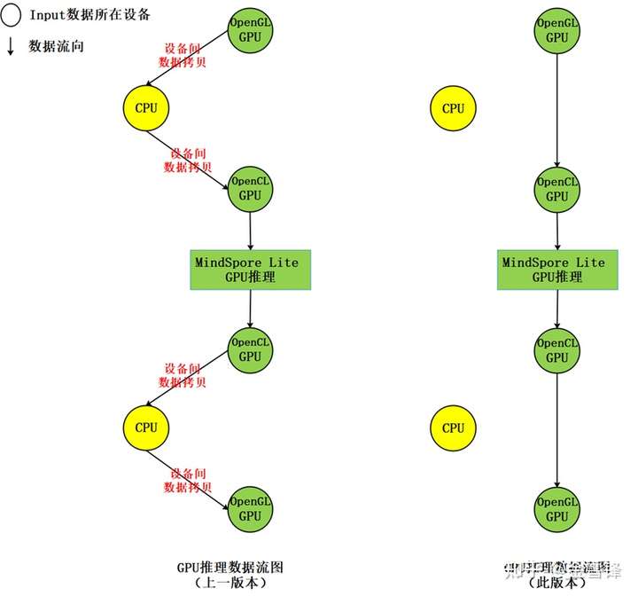 此版本中,MindSpore Lite支持将OpenGL纹理数据作为推理模型的输入,推理输出结果也为OpenGL纹理,实现端到端推理过程中,减少CPU和GPU间的数据拷贝,从而达到提升推理性能降低功耗的目的;相比上一版本,能够减少四次设备间的内存拷贝,示意如下图: