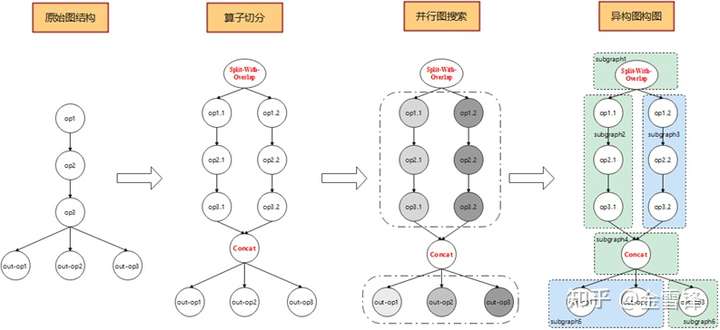异构并行功能会在构图阶段,根据异构硬件的能力进行构图操作。构图操作分为切分算子与构造异构图两部分。切分算子会将原本不适合异构并行的模型重构成适合异构并行的,且并行分支的运算量能够严格匹配异构硬件的执行能力。构造异构图操作会根据模型现有的图结构进行并行子图搜索,最终确定异构并行图。构图的整体解决方案不局限于模型原始结构,使得异构并行可以应用于泛化模型。