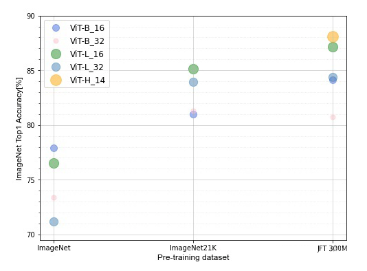 以下样例绘制了ViT系列模型分别在ImageNet、ImageNet21K、JFT-300M预训练数据集训练,然后在ImageNet数据集上进行finetune后的Top1精度对比。