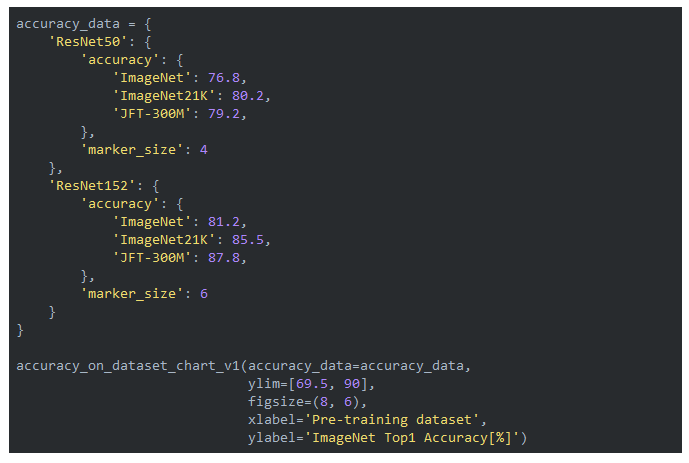 函数accuracy_model_size_chart主要用于绘制在不同大小的预训练数据集上模型之间的精度对比。