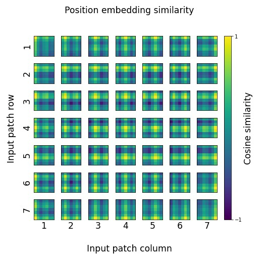 每一个位置编码都和自己的同一行或者同一列有较高的余弦相似度,说明图像的同一行或者同一列具有较强的位置关系。