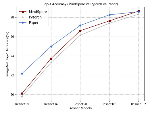 以下样例绘制了Resnet系列模型分别在MindSpore、Pytorch、Paper下的模型精度对比。结论如下: