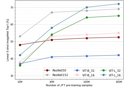 以下样例绘制了Resnet系列模型和ViT系列模型分别在10M、30M、100M、300M的JFT-300M预训练数据集训练,将ImageNet数据集1000类中的每一类随机采样5张图片作为验证数据集,然后将不同大小预训练数据集的预训练模型作为特征提取层,在验证数据集上直接进行精度对比。结论如下: