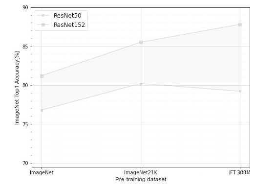 以下样例绘制了Resnet系列模型分别在ImageNet、ImageNet21K、JFT-300M预训练数据集训练,然后在ImageNet数据集上进行finetune后的Top1精度的区间范围。