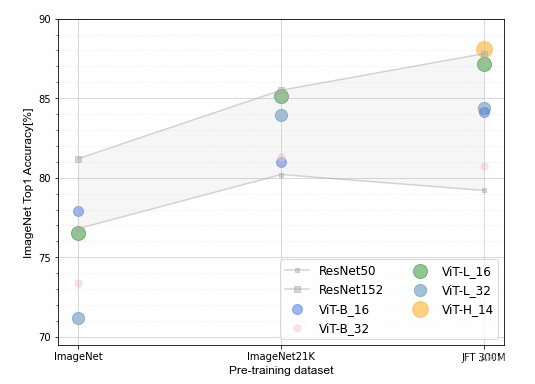以下样例绘制了Resnet系列模型和ViT系列模型分别在ImageNet、ImageNet21K、JFT-300M预训练数据集训练,然后在ImageNet数据集上进行finetune后的Top1精度对比。结论如下:
