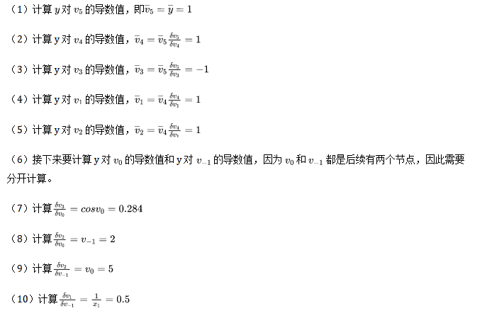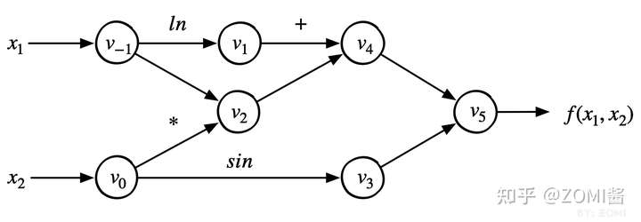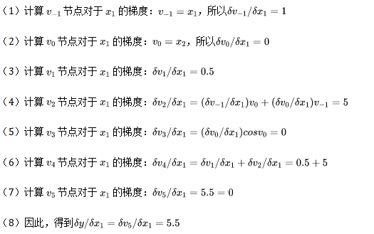 - 中间变量 :中间变量这里是 v-1到 v5,在计算过程中,只需要针对这些中间变量做处理即可。将符号微分法应用于最基本的算子,然后代入数值,保留中间结果,最后再应用于整个函数