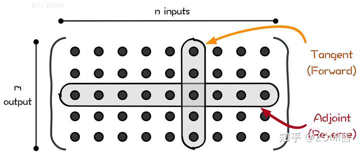 即如图所示,前向自动微分(tangent mode AD)和后向自动微分(adjoint mode AD)分别计算了Jacobian矩阵的一列和一行。