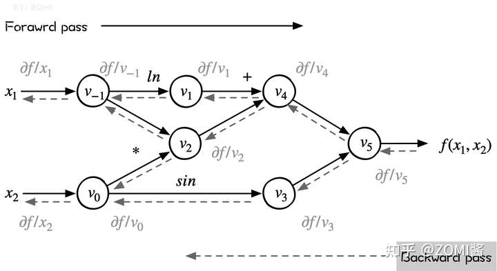 反向模式的计算过程如图所示,其中: