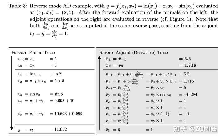 可以仅通过一次对计算过程的遍历得到Jacobian矩阵的一行。但它的导数链式法则传递方向和程序执行方向相反,所以需要在程序计算过程中记录一些额外的信息来辅助求导,这些辅助信息包括计算图和计算过程的中间变量。