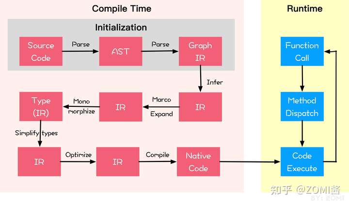 最后通过 LLVM 或者其他等不同的底层编译器,最后把 IR 编译成机器码,然后就可以真正地在runtime执行起来。