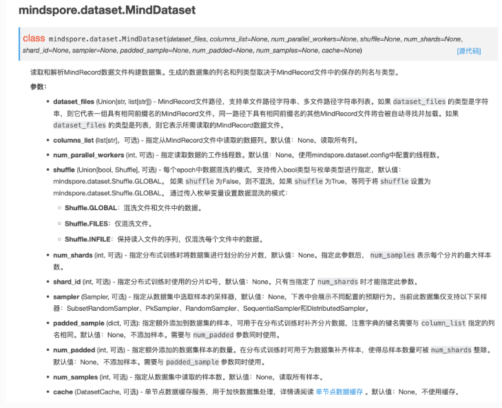 Dive Into MindSpore – MindDataset For Dataset Load MindSpore易点通·精讲系列–数据集加载之MindDataset 本文开发环境 Ubuntu 20.04 Python 3.8 MindSpore 1.7.0 本文内容摘要 背景介绍 先看文档 数据生成 数据加载 问题解答 本文总结 本文参考 1. 背景介绍 在前面的文章中,我们介绍了ImageFolderDataset、CSVDataset及TFRecordDataset三个数据集加载API。本文为数据集加载部分的最后一篇文章(当然,如果后续读者有需要,再考虑补充其他API精讲),我们将介绍MindSpore中官方数据格式MindRecord加载所涉及的API的MindDataset。 一个完整的机器学习工作流包括数据集读取(可能包含数据处理)、模型定义、模型训练、模型评估。如何在工作流中更好的读取数据,是各个深度学习框架需要解决的一个重要问题。为此,TensorFlow推出了TFRecord数据格式,而MindSpore给出的解决方案就是MindRecord。在正式开始本文的讲解之前,先来看看MindRecord数据格式的特点: 实现数据统一存储、访问,使得训练时数据读取更加简便。 数据聚合存储、高效读取,使得训练时数据方便管理和移动。 高效的数据编解码操作,使得用户可以对数据操作无感知。 可以灵活控制数据切分的分区大小,实现分布式数据处理。 2. 先看文档 老传统,先看官方文档。