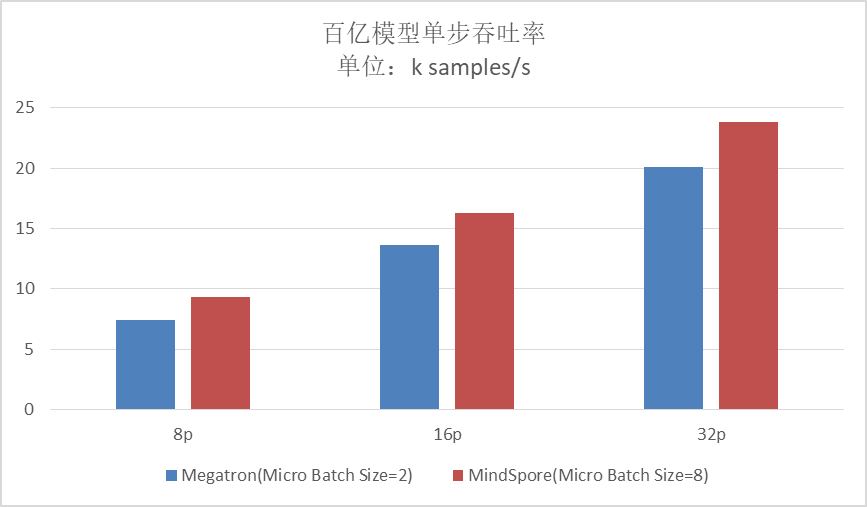 - 32P Megatron的最大吞吐率为20.1k samples/s,MindSpore最大吞吐率为23.8k samples/s,超过Megatron 18%。